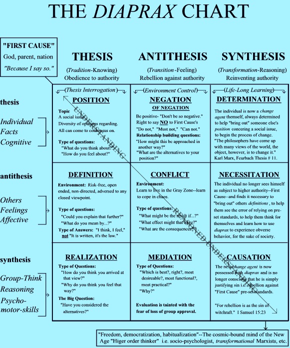 I call this liberal, New Age, socialist, mental disease diaprax(dialectic + praxis). The dialectic requires everyone using it to willingly question any absolute, prior established fact, or position. Praxis requires everyone to personally experience dialectic behavior in a facilitated, group-think environment where everyone must participate. Using diapraxleads to the abandonment of faith in overt authority (God, parent, teacher, nation, etc.), resulting in defiance against such authority. Using diaprax blinds the user of his dependence on covert authority, resulting in an addiction to covert authority rather than faith in overt authority. Covert authority is only concerned about usurping overt authority's position of influencing others.